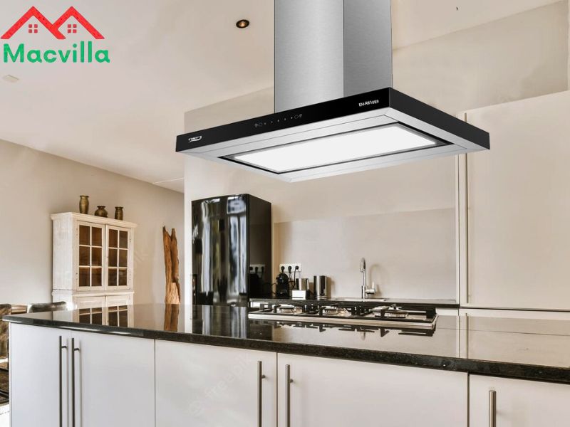 Máy hút mùi đảo thường có thiết kế treo độc lập trên trần, phù hợp với bếp đảo.